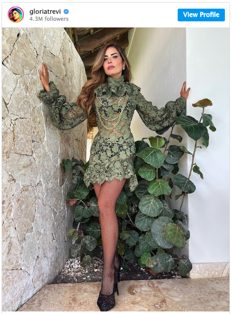 En su cuenta de Instagram, en donde tiene más de cuatro millones 300 mil seguidores, Gloria Trevi compartió la fotografía en la que aparece en un pasillo, posando con las dos manos sobre los muros que la rodean, con el cabello peinado en ondas y utilizando el mini vestido de encaje verde con mangas largas y bombachas y olanes en el cuello.