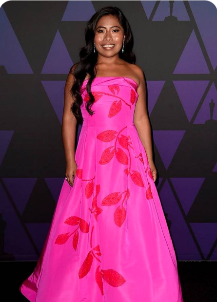 En uno de los encuentros organizados en el marco de los Premios Oscar en 2018, Yalitza Aparicio deslumbró por completo a sus colegas presentes con un magnífico maxi vestido off shoulder fucsia estampado con delicadas flores rojas, transformándose en toda una princesa de cuento de hadas.