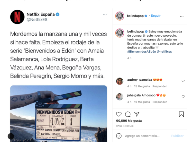 “Estoy muy emocionada de compartir este nuevo proyecto, tenía muchas ganas de trabajar en España por muchas razones, esto te lo dedico a ti abuelita #BienvenidosAEdén @netflixes”, escribió la cantante junto al mensaje con el que se confirma el inicio del rodaje.