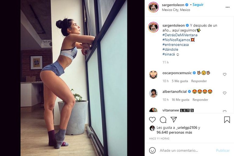 Acompañó la imagen con un mensaje en el que recuerda el inicio de la pandemia. En la publicación luce un atuendo de top gris, short azul así como un calcetín de un color guinda y otro en tonos grises; ella está recargada en el marco de su ventana y mira a través de la misma.