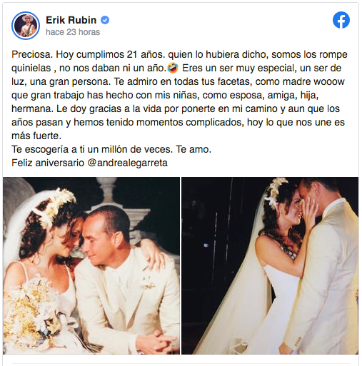 Por su parte y para continuar con el romántico día, Erik Rubín también compartió algunas imágenes de la boda celebrada en el año 2000: “Quién lo hubiera dicho, somos los rompe quinielas, no nos daban ni un año”, bromeó.