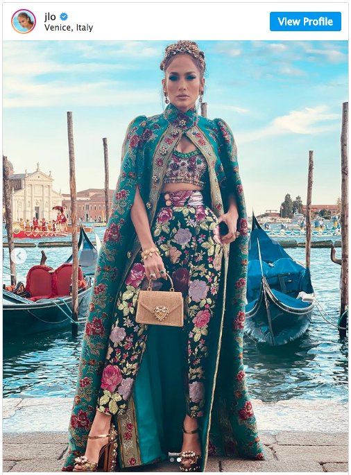 Jennifer Lopez arrasó con Venecia con un look repleto de pedrería y bordados artesanales de la nueva colección de los directores creativos de Dolce & Gabbana.